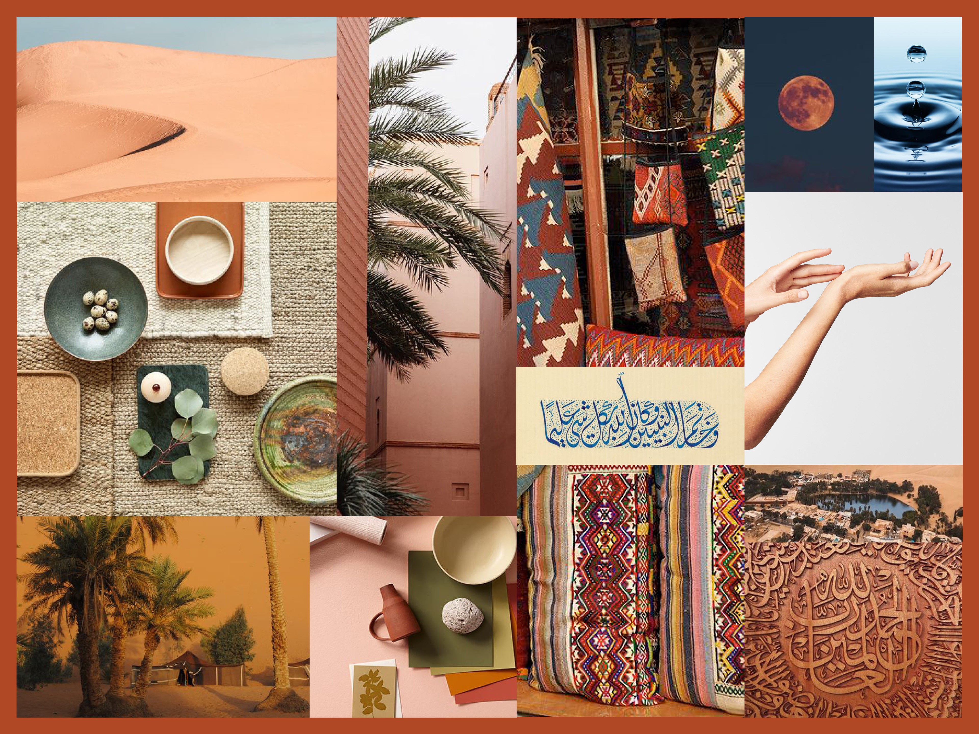 I wanted to center the story-telling aspect of the business that highlights and celebrates the culture (especially craftsmanship) of where the whole production process takes place from start to end. The importance of the Arabic language and poetry in Arabia were the inspiration for the calligraphed logo. The main element of the brand is a graphic combination of elements that overlap each other; they are made of Kilim (Arabian rugs) motifs that have meanings, natural elements in the desert, and the simple shapes you find in a desert. Hence, each combination has a meaning and tells a story. The patterns can be assembled in various combinations, depending on the mood, usage, and need.